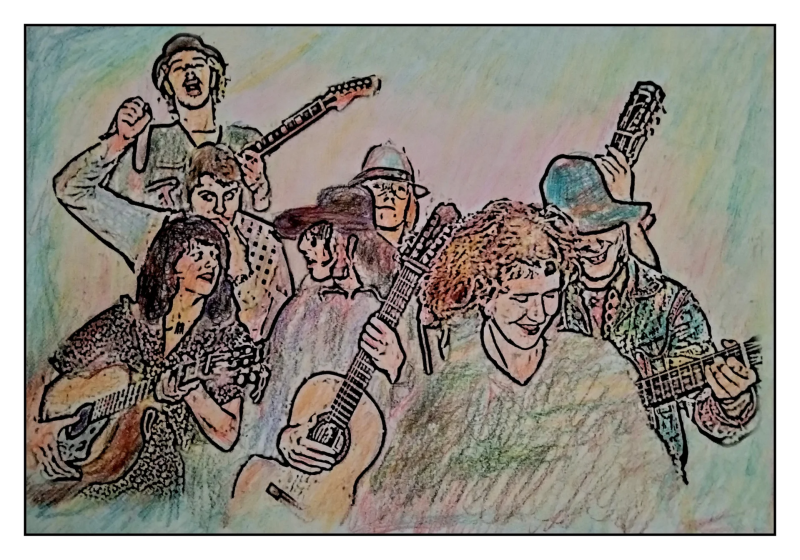 Hier rechts onder zie je Marijke op de voorgrond van onze schoolband "LOS BALLOS" (ongeveer in de leeftijd van 15 jaar.) Hier beneden de photodrawing van Marijke die ik maakte vanuit Facebook in 2023 (50 jaar later)