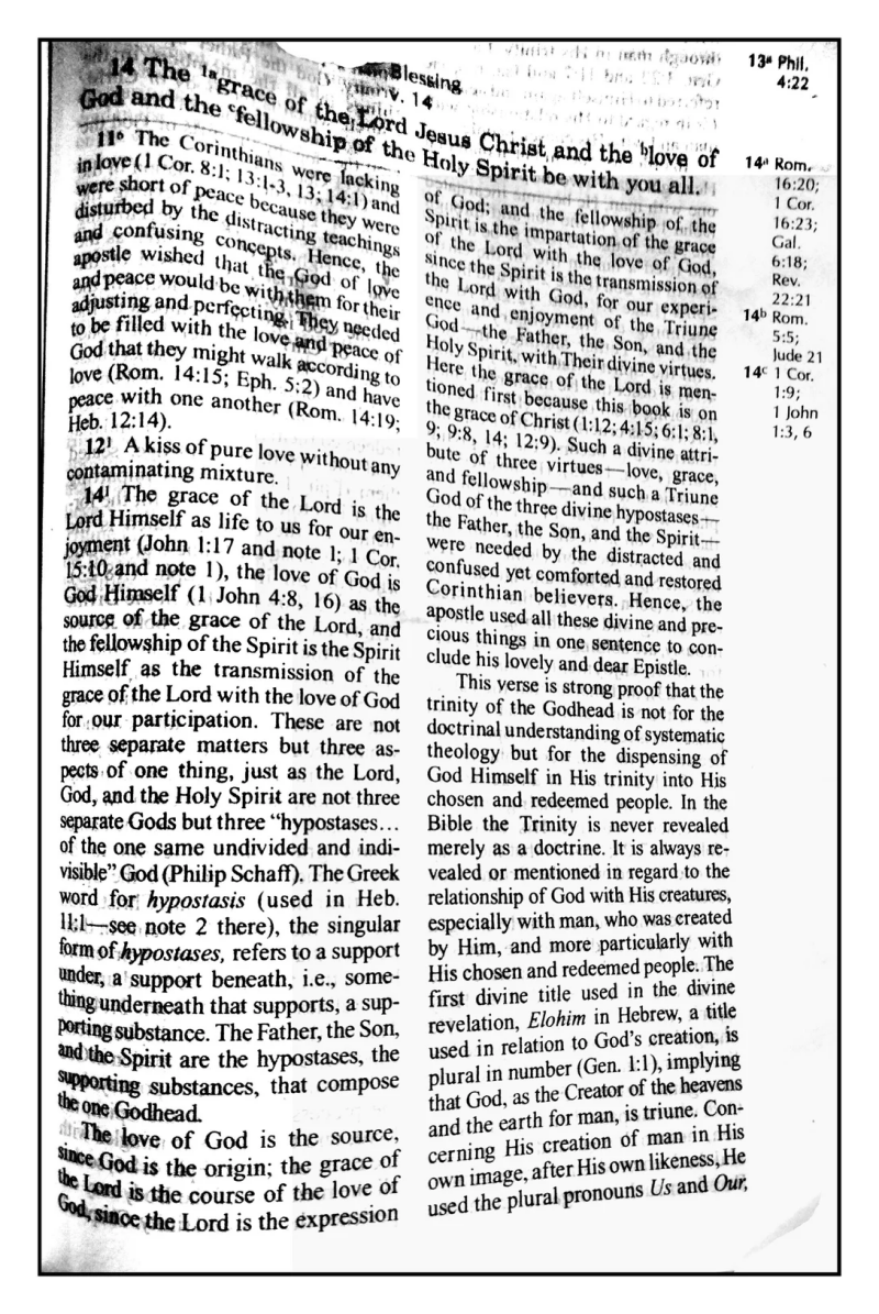 Thus, it is evident that the divne revelation of the trinity of the Godhead in the holy Word, from Genesis through Revelation, is not for theological study but fort he apprehending of how God in His mysterious and marvelous trinity dispenses Himself into His chosen people, that we as His chosen people, that we as His chosen and redeemed people may, al indicated in the apostle’s blessing to indicated in the apostle’s blessing tot he Corinthian believers, participate in, experience, enjoy, and possess the processed Triume God no wand for eternity. Amen
