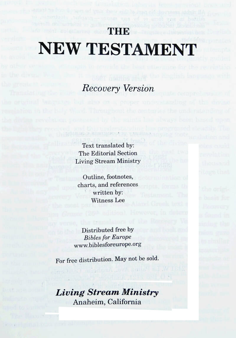 ECHTER MIJN OVERTUIGING BEGON MET DE LEER VAN DE 2 CHINEZEN WATCHMAN NEE EN WITNESS LEE DIE DE BIJBEL HEBBEN WILLEN BESTUDEREN EN DAARMEE EEN ZEER GROTE VERSPREIDING OVER DE HELE WERELD HEBBEN KUNNEN BEREIKEN. EN LIJDEN KWAM DAAR ZEKER OOK IN VOOR. WATCHMAN NEE WERD ZONDER WERKELIJKE GOEDE REDEN IN DE GEVANGENIS GESTOPT EN MOCHT NIET HET WOORD VAN DE WERKELIJKE LIEFDE IN CHINA LANGER VERKONDIGEN. WITNESS LEE IS ECHTER CHINA ONTVLUCHT EN HEEFT UITEINDELIJK HUN IDEE IN ANAHEIM VOORT GEZET EN HEEFT EEN HERSTELVERSIIE VAN DE BIJBEL WILLEN SCHRIJVEN DIE NOG STEEDS WERELDWIJD ZELFS GRATIS VERSPREID WORDT